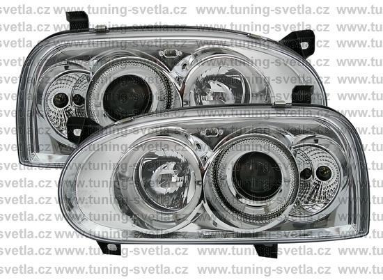 Popis: VW Golf III (1992-1997) přední Angel Eyes světla v provedení chrom. Žárovky H1+H1-jsou součastí světel. Cena za pár.