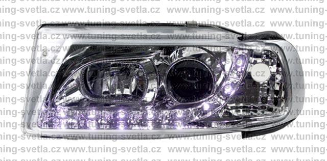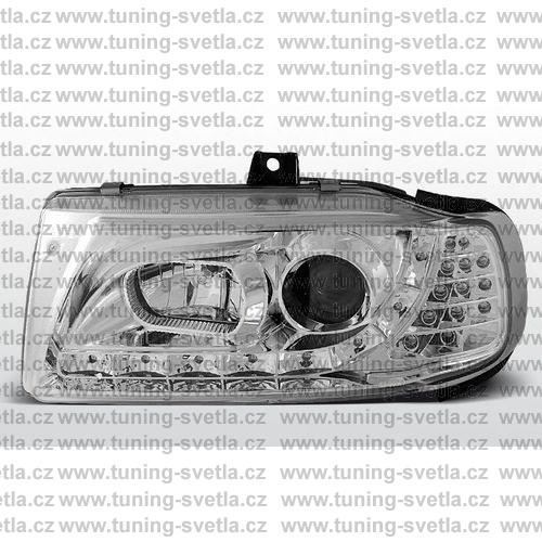 Popis: Seat Ibiza (3/93 - 8/99) přední světla Day Line v chromovém provedení. Patice pro žárovky H1+ H1. El. nastavitelná pomocí motorků z originálních světel. Cena za pár. Led svícení místo parkovacího světla