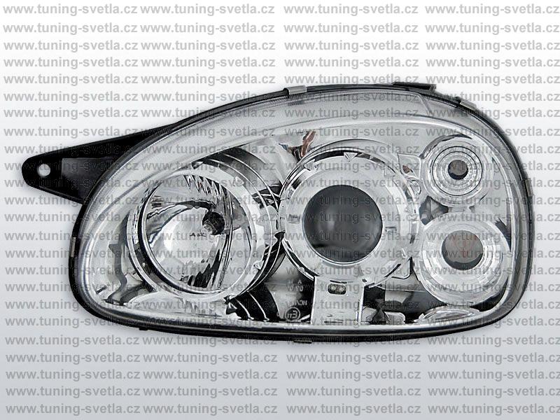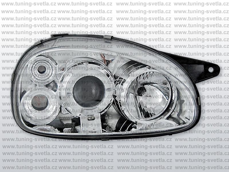Popis: Opel Corsa (9/93 - 9/00) přední světla Angel Eyes v chromovém provedení. Patice pro žárovky H1+H1. El. nastavitelná pomocí motorků z originálních světel. Cena za pár.