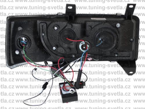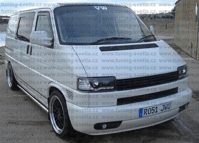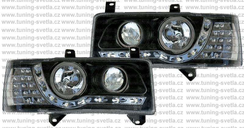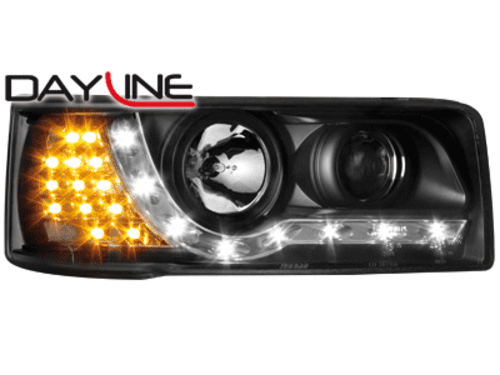 Popis: VW T4 (90-03) Starý Model. Přední DayLine světla v černém provedení s LED blikačem. LED svícení místo parkovacího světla. Patice pro žárovky H1+ H1. Cena za pár.