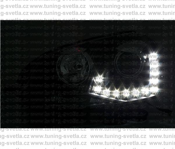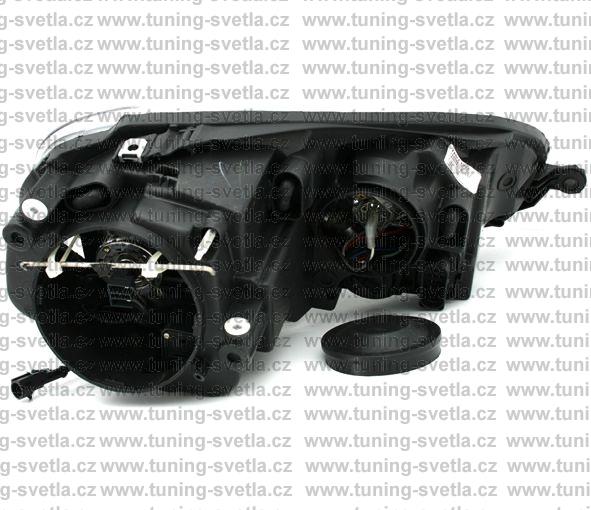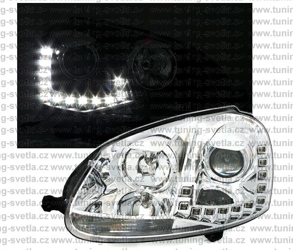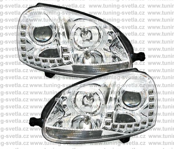 Popis: VW Golf 5 (10/03-9/08) přední světla s denním svícením v chrom provedení. Patice pro žárovky H1+ H7. Cena za pár. Podpora El. naklápění-motorek je součástí světla.