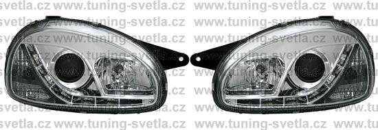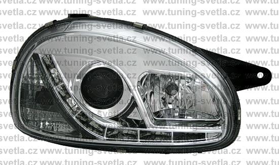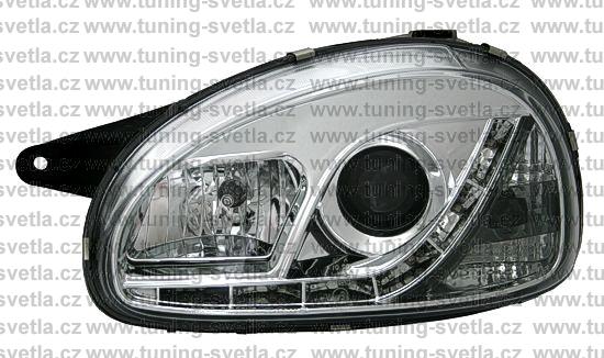 Popis: Opel Corsa (9/93 - 9/00) přední světla s denním svícením v chromovém provedení. Patice pro žárovky H1+H1. El. nastavitelná pomocí motorků z originálních světel. Cena za pár.