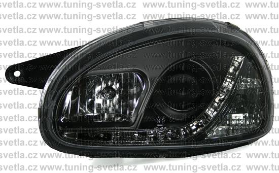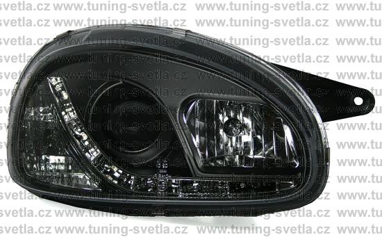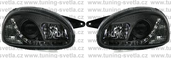 Popis: Opel Corsa (9/93 - 9/00) přední světla s denním svícením v černém provedení. Patice pro žárovky H1+H1. El. nastavitelná pomocí motorků z originálních světel. Cena za pár.
