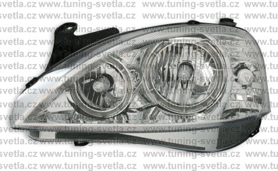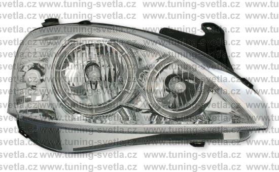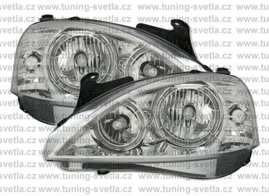 Popis: Opel Corsa (11/00 - 6/06) přední světla Angel Eyes v chromovém provedení. Patice pro žárovky H7+H7. El. nastavitelná pomocí motorků z originálních světel. Cena za pár.