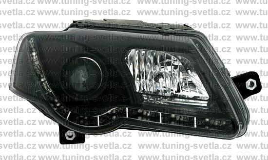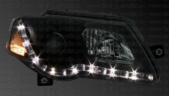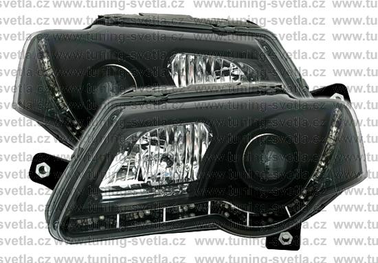 Popis: VW Passat B6 (3/05-) přední DAYLINE světla. Provedení černé. Patice na žárovky H1+H7. El. motorek pro naklápění je součastí světla. Cena za sadu. Led svícení místo parkovacího světla.