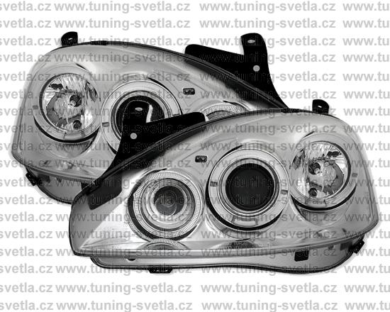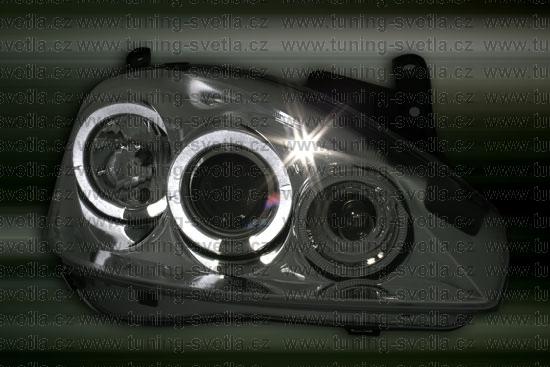 Popis: Opel Corsa (11/00 - 6/06) přední světla Angel Eyes v chromovém provedení. Patice pro žárovky H1+H1. El. nastavitelná pomocí motorků z originálních světel. Cena za pár.