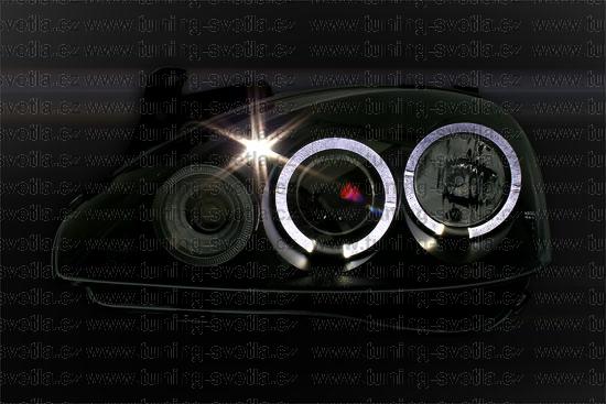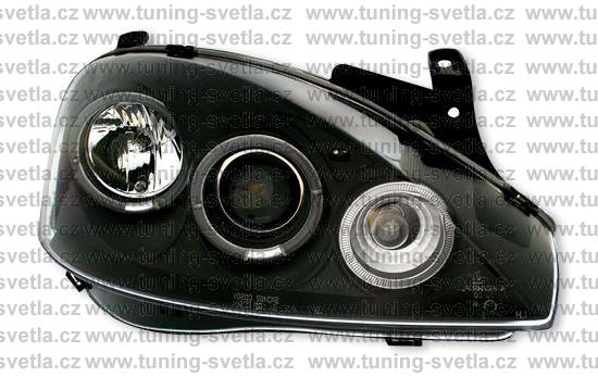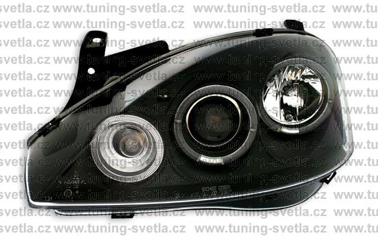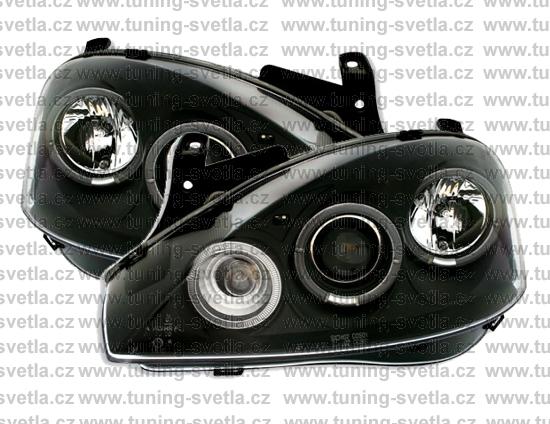 Popis: Opel Corsa (11/00 - 6/06) přední světla Angel Eyes v černém provedení. Patice pro žárovky H1+H1. El. nastavitelná pomocí motorků z originálních světel. Cena za pár.