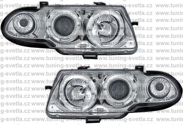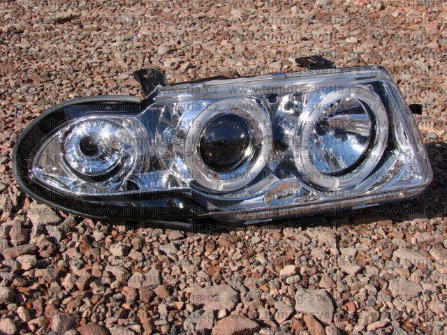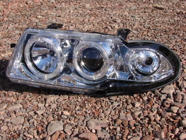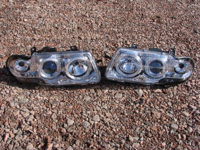 Popis: Opel Astra (10/91 - 2/98) přední světla Angel Eyes v chromovém provedení. Patice pro žárovky H1+H1. El. nastavitelná pomocí motorků z originálních světel. Cena za pár.