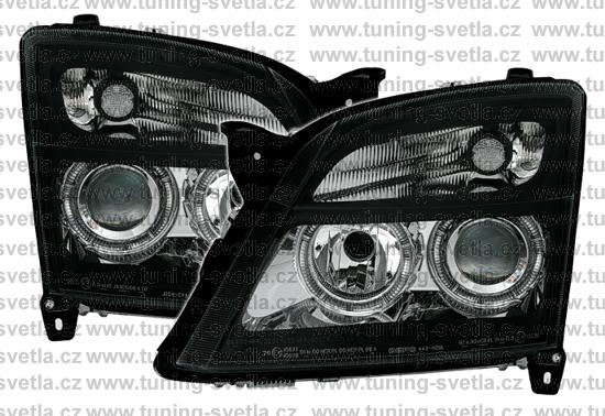 Popis: Opel Vectra (4/02 - 7/05) přední světla Angel Eyes v černém provedení. Patice pro žárovky H7+H7. El. nastavitelná pomocí motorků z originálních světel. Cena za pár.