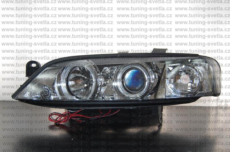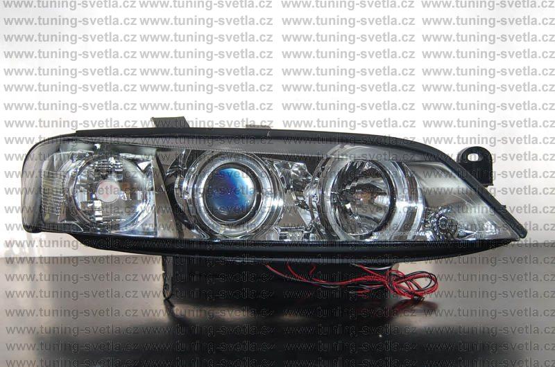 Popis: Opel Vectra (11/95 - 12/98) přední světla Angel Eyes v chromovém provedení. Patice pro žárovky H1+H1. El. nastavitelná pomocí motorků z originálních světel. Cena za pár.