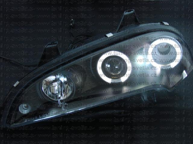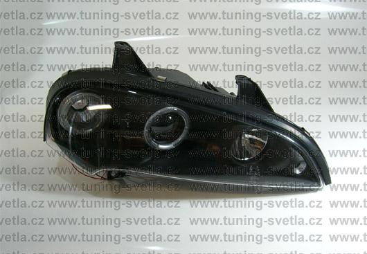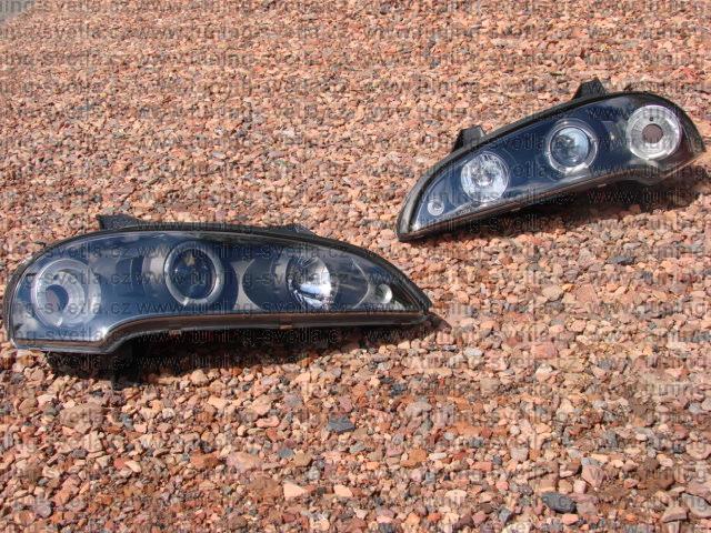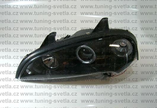 Popis: Opel Tigra (10/94 - 9/00) přední světla Angel Eyes v černém provedení. Patice pro žárovky H1+H1. El. nastavitelná pomocí motorků z originálních světel. Cena za pár.