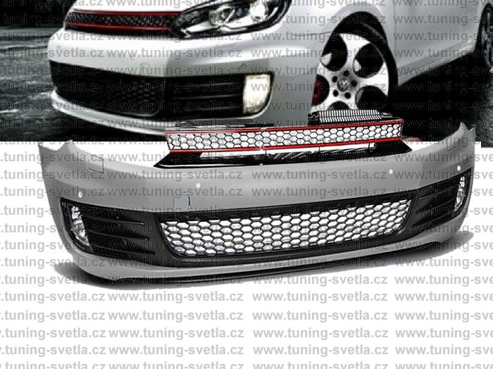 Popis: VW Golf 6 přední nárazník s otvory pro PDC, vzhled GTi. Materiál ABS plast. V sadě je : přední nárazník,mlhovky,maska a mřížky. Nárazník má otvory pro ostřikovače.