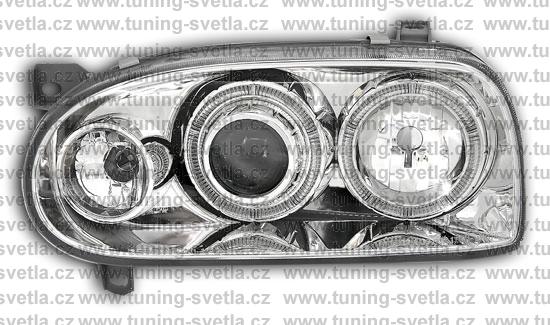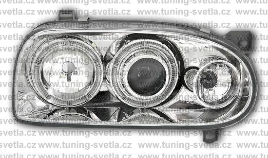Popis: Vw Golf 3 (1991-1998) přední Angel Eyes světla v chromovém provedení. Patice pro žárovky H7+H7. Integrované přední blikače. Cena za pár.