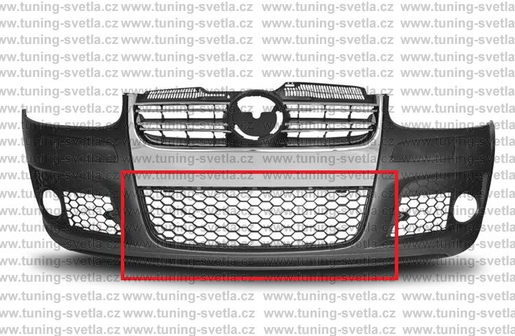 Popis: VW Golf 5 (2003-2009) středová mřížka nárazníku GTi. Materiál ABS plast.