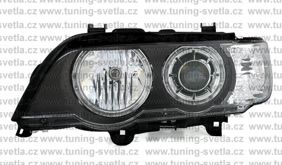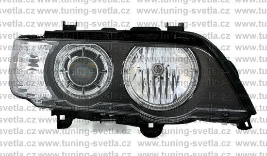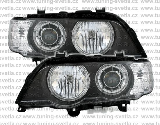Popis: BMW X5 (5/00 - 11/03) přední světla Angel Eyes v černém provedení. Patice pro žárovky H7+H7. El. motorky jsou součástí světel. Cena za pár.