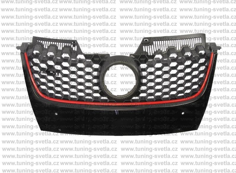 Popis: VW Golf 5 přední maska s červeným lemováním. Znak VW není součástí balení. Rychlá a snadná montáž na auto. Pasuje pouze na GTi nárazník.