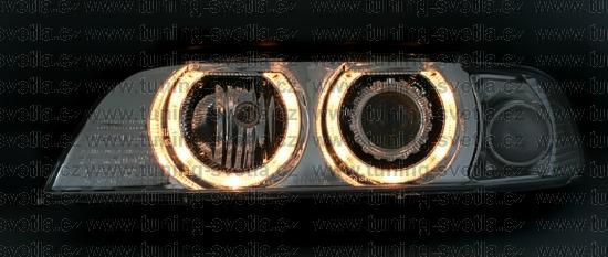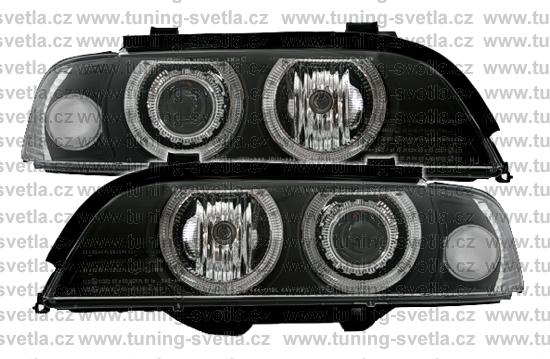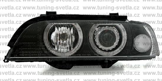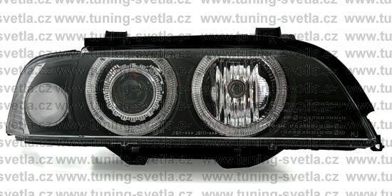 Popis: BMW E39 (9/95 - 8/00) přední světla Angel Eyes v černém provedení. Patice pro žárovky H7+H7. El. motorky jsou součastí světel. Cena za pár.