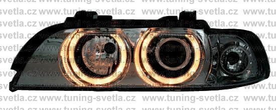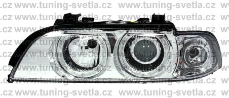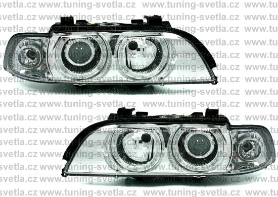 Popis: BMW E39 (9/95 - 8/00) přední světla Angel Eyes v chromovém provedení. Patice pro žárovky H7+H7. El. motorky jsou součastí světel. Cena za pár.