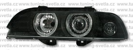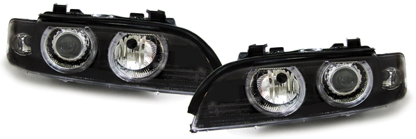 Popis: BMW E39 (9/95 - 8/00) přední světla Angel Eyes v černém provedení. Patice pro žárovky H7+H7. El. motorky jsou součastí světel. Cena za pár.