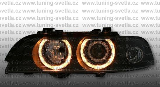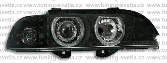 Popis: BMW E39 (9/95 - 8/00) přední světla Angel Eyes v černém provedení. Patice pro xenon D2S+H7. El. motorky jsou součastí světel. Cena za pár.