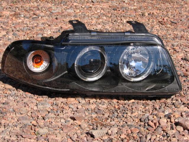 Popis: Audi A4 (02/99 - 2001) přední světla Angel Eyes v černém provedení. Patice pro žárovky H1+H1. El. nastavitelná pomocí motorků z originálních světel. Cena za pár.