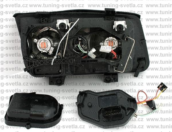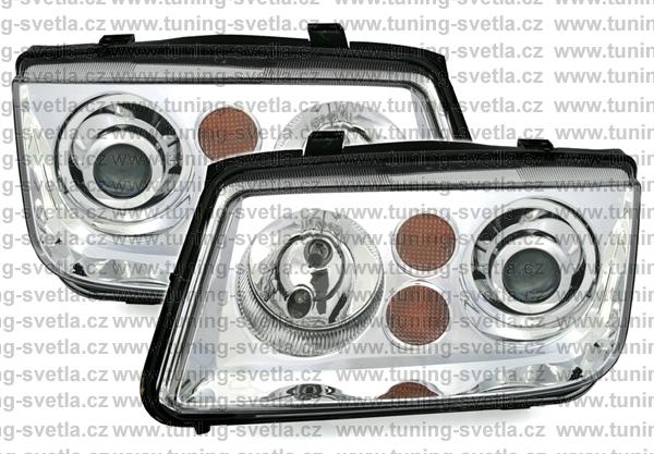 Popis: VW Bora (10/98-7/05) přední světla s čočkou v chromovém provedení. Patice na žárovky H7+H7. El. motorek je součásti světla. Cena za sadu.