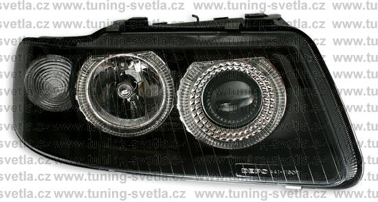 Popis: Audi A3 (9/00 - 3/03) přední světla Angel Eyes v černém provedení. Patice pro žárovky H7+H7. El. nastavitelná pomocí motorků z originálních světel. Cena za pár.