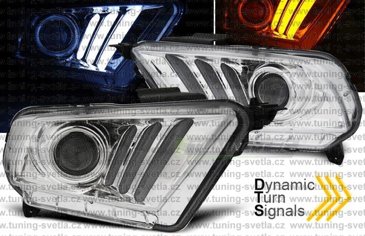 Popis: Ford Mustang (2010-2013) přední TUBE LIGHT světla s dynamickým LED blikačem v chrom provedení. Patice pro žárovky H1+H1. Cena za pár.