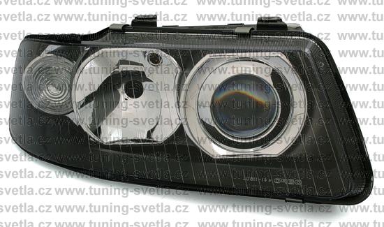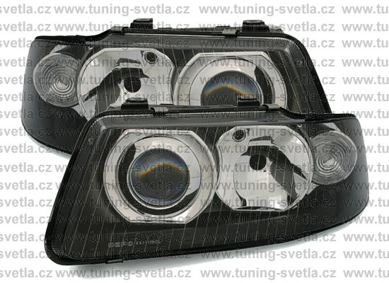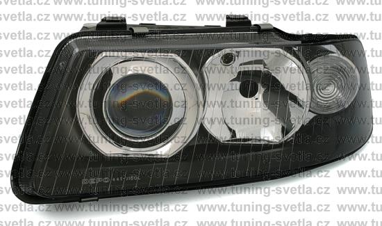 Popis: Audi A3 (9/00 - 3/03) přední světla v černém provedení. Patice pro žárovky H1+H7. El. nastavitelná pomocí motorků z originálních světel. Cena za pár.