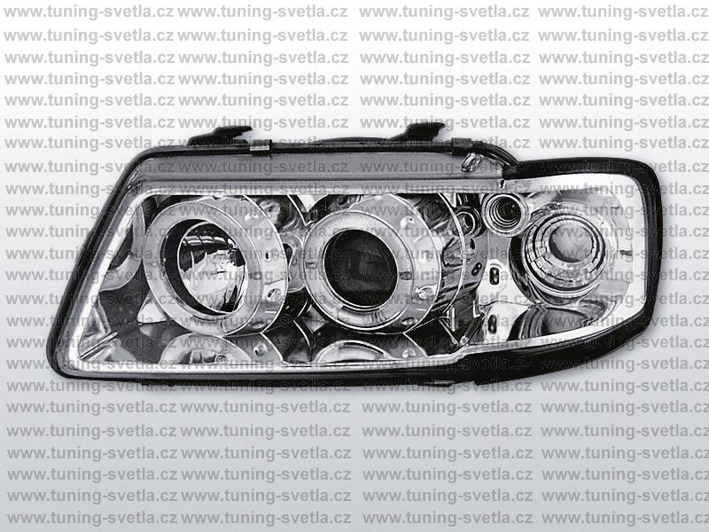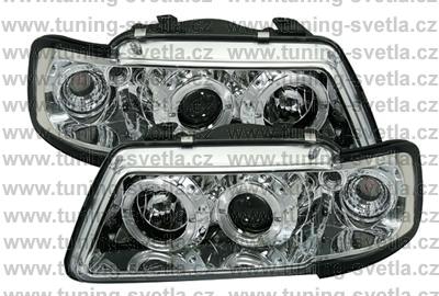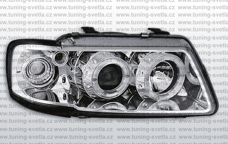 Popis: Audi A3 (8/96 - 8/00) přední světla Angel Eyes v chromovém provedení. Patice pro žárovky H1+H1. El. nastavitelná pomocí motorků z originálních světel. Cena za pár.