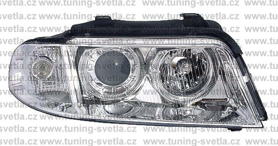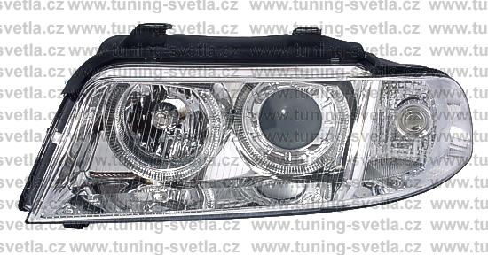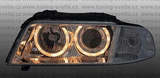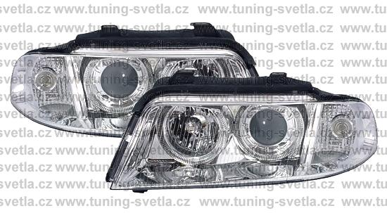 Popis: Audi A4 -facelift- (2/99 - 2/01) přední světla Angel Eyes v chromovém provedení. Patice pro žárovky H7+H7. El. nastavitelná pomocí motorků z originálních světel. Cena za pár.