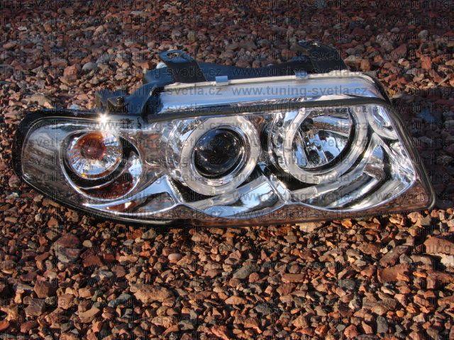 Popis: Audi A4 (11/94 - 1/99) přední světla Angel Eyes v chromovém provedení. Patice pro žárovky H1+H1. El. nastavitelná pomocí motorků z originálních světel. Cena za pár.