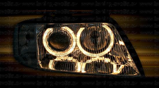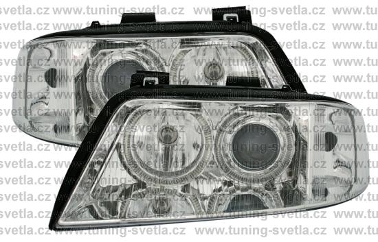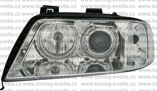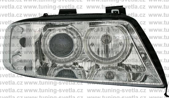 Popis: Audi A6 (5/01 - 4/04) přední světla Angel Eyes v chromovém provedení. Patice pro žárovky H7+H7. El. nastavitelná pomocí motorků z originálních světel. Cena za pár.