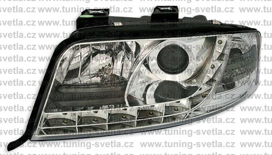 Popis: Audi A6 (97-01) přední světla s denním svícením v chromovém provedení. Patice pro žárovky H1+H1. El. nastavitelná pomocí motorků z originálních světel. Cena za pár.
