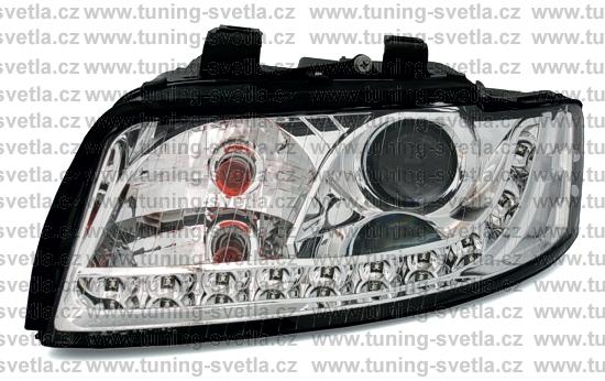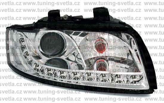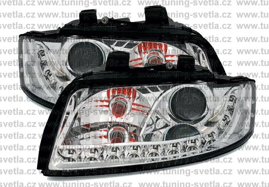 Popis: Audi A4 přední světla s denním svícením v chromovém provedení. Patice pro žárovku H7. El. nastavitelná pomocí motorků z originálních světel. Cena za pár.