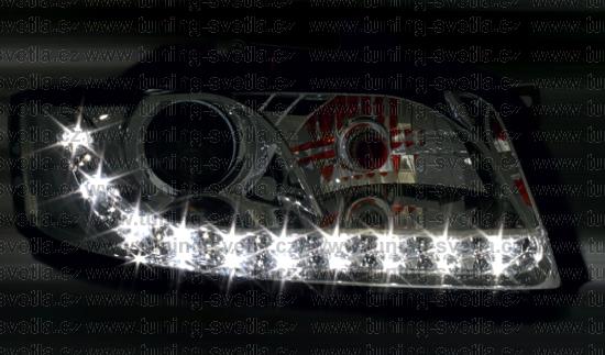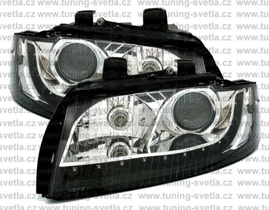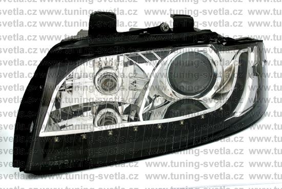 Popis: Audi A4 přední světla s denním svícením v černém provedení. Patice pro žárovku H7. El. nastavitelná pomocí motorků z originálních světel. Cena za pár.