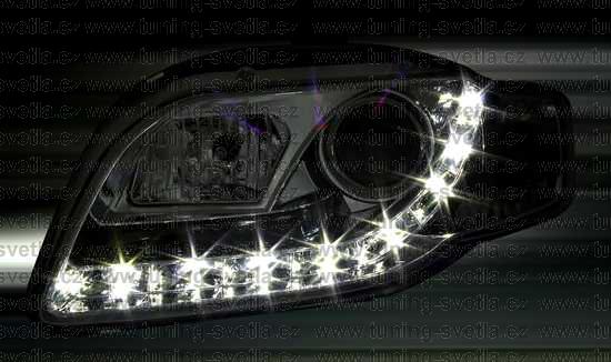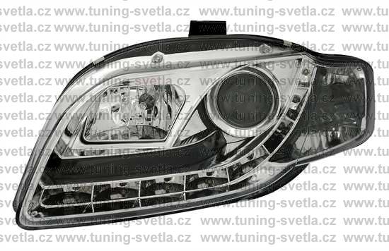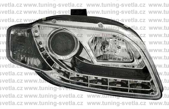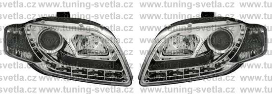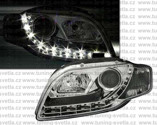 Popis: Audi A4 (11/04-11/07) přední světla s denním svícením v chromovém provedení. Patice pro žárovky H1+H1. El. nastavitelná pomocí motorků,které jsou součastí světla. Cena za pár.