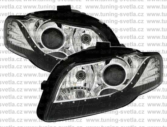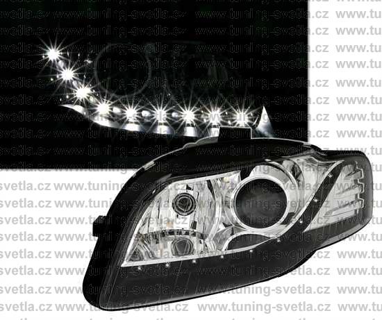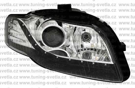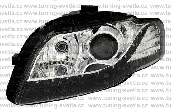 Popis: Audi A4 (11/04-11/07) přední světla s denním svícením v černém provedení. Patice pro žárovku H7. El. nastavitelná pomocí motorků,které jsou součastí světla. Cena za pár.