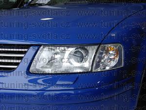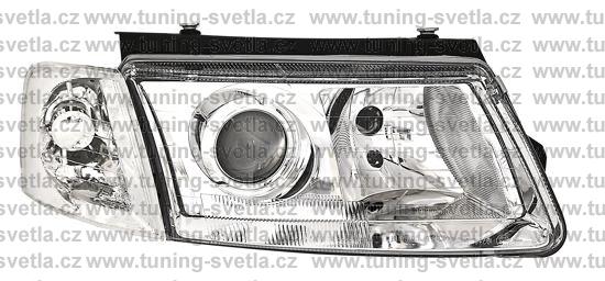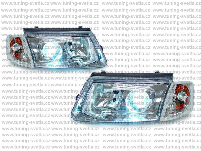 Popis: VW Passat B5 (1996-2000) přední světla s čočkou + přední čiré blinkry. Patice na žárovky H7+H7. El. nastavitelná pomocí motorků z originálních světel.