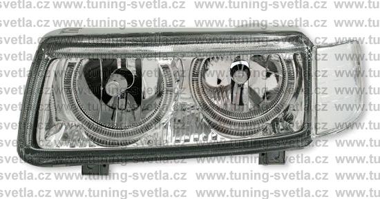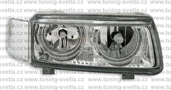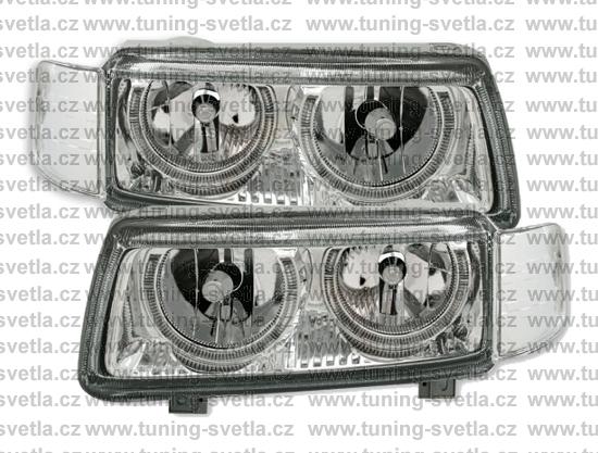 Popis: VW Passat B4 (11/93-10/96) přední angel eyes světla. Provedení chrom. Patice na žárovky H7+H7. El. nastavitelná pomocí motorků z originálních světel. Cena za sadu.