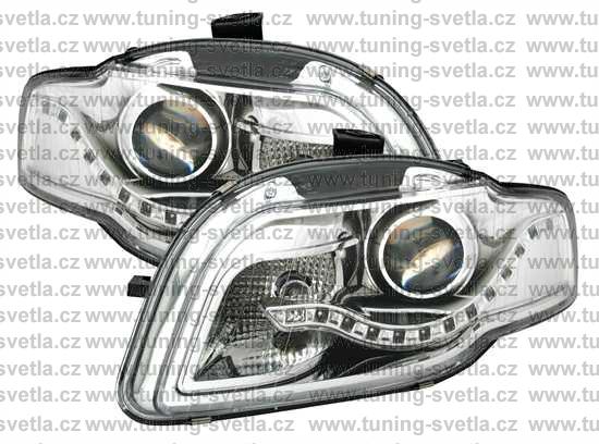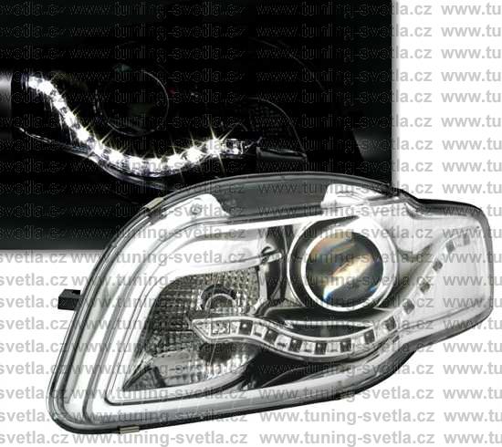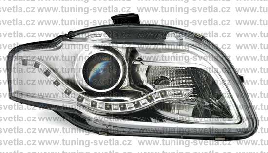 Popis: Audi A4 (11/04-11/07) přední světla s denním svícením v chromovém provedení. Patice pro žárovku H9. El. nastavitelná pomocí motorků,které jsou součastí světla. Cena za pár.
