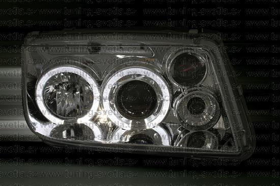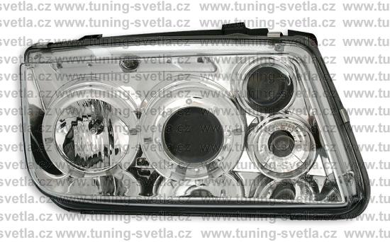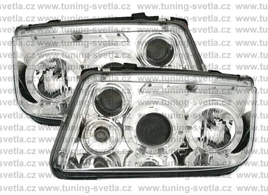 Popis: VW Bora (10/98-7/05) přední Angel Eyes světla v chromovém provedení. Patice na žárovky H1+H1+H3. El. nastavitelná pomocí motorků z originálních světel. Cena za sadu.
