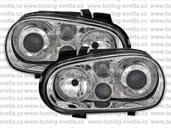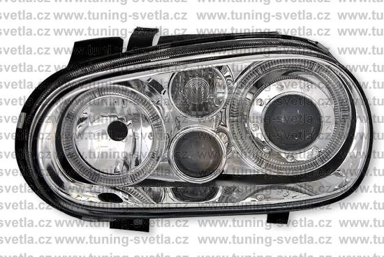 Popis: VW Golf 4 přední Angel Eyes světla v chromovém provedení. Patice pro žárovky H7+ H7 + H3. Cena za pár.