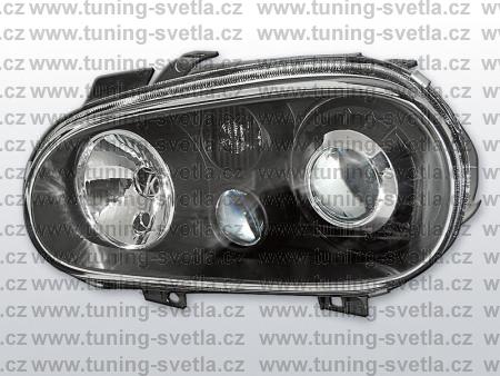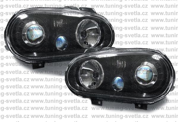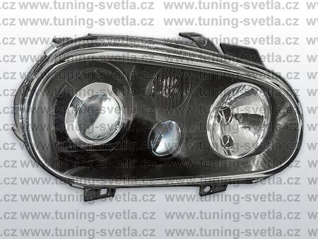 Popis: VW Golf 4 přední světla v černém provedení. Patice pro žárovky H7+ H7 + H3. Cena za pár.