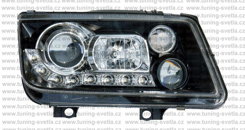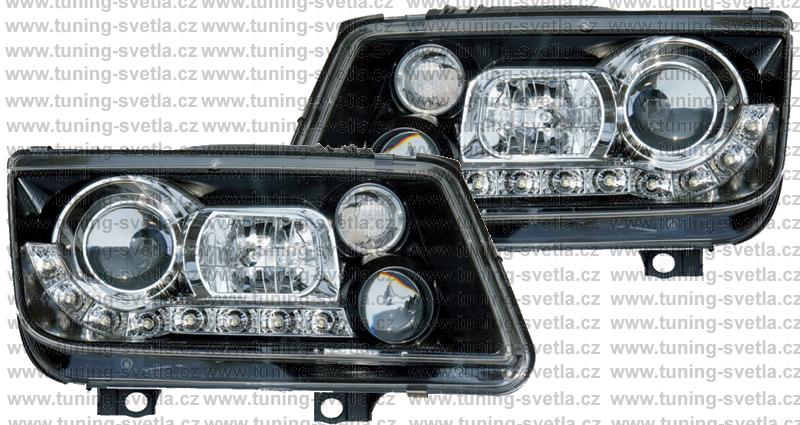 Popis: VW Bora (10/98-7/05) přední světla Day Line. Led svícení místo parkovacího světla. Provedení černé. Patice na žárovky H1+H1+H3. El. nastavitelná pomocí motorků z originálních světel. Cena za sadu.