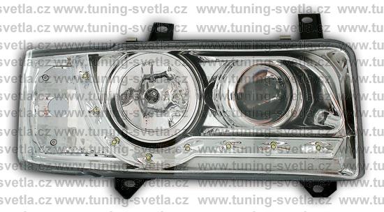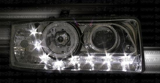 Popis: VW T4 (90-03) Starý Model. Přední DayLine světla v chromovém provedení. LED svícení místo parkovacího světla. Patice pro žárovky H1+ H1. Cena za pár.