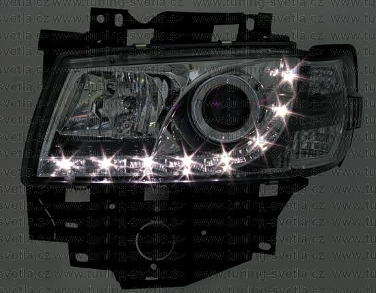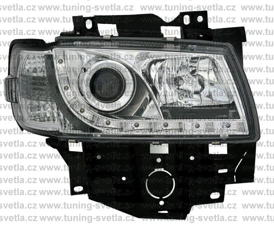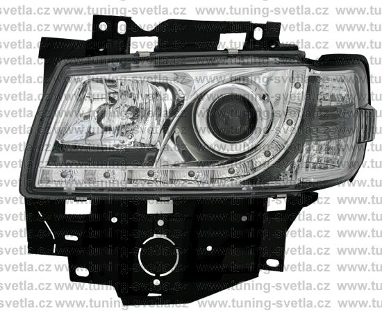 Popis: VW T4 (96-03) facelift. Přední DayLine světla v chromovém provedení. LED svícení místo parkovacího světla. Patice pro žárovky H1+ H1. Cena za pár.