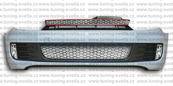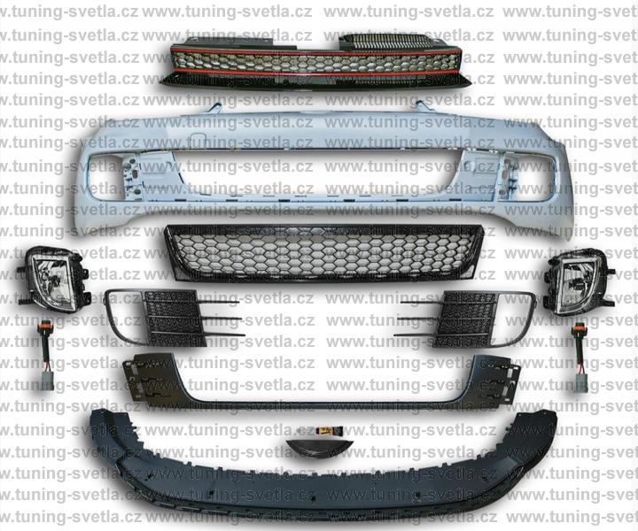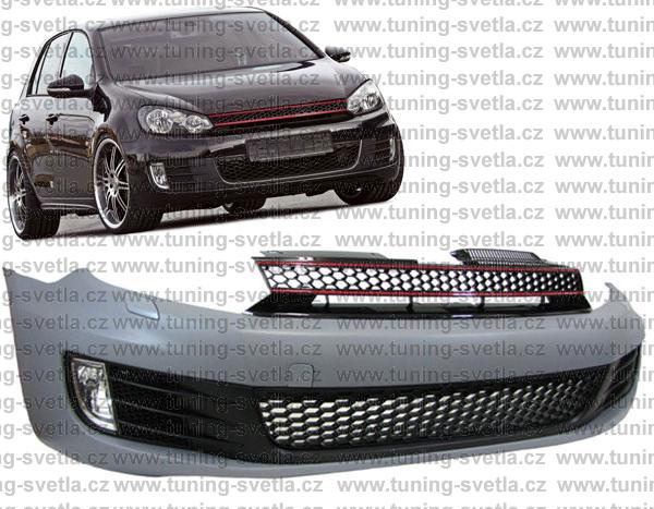 Popis: VW Golf 6 přední nárazník vzhled GTi. Materiál ABS plast. V sadě je : přední nárazník,mlhovky,maska a mřížky.