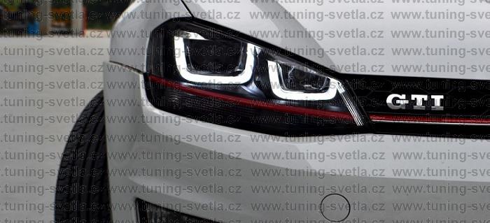 Popis: VW Golf 7 (11/2012-) přední světla GTI LOOK v černém provedení s červeným páskem. Světla mají LED denní svícení. Žárovky H7+H1. El.motorek pro naklápění je součástí světla. Cena za pár.