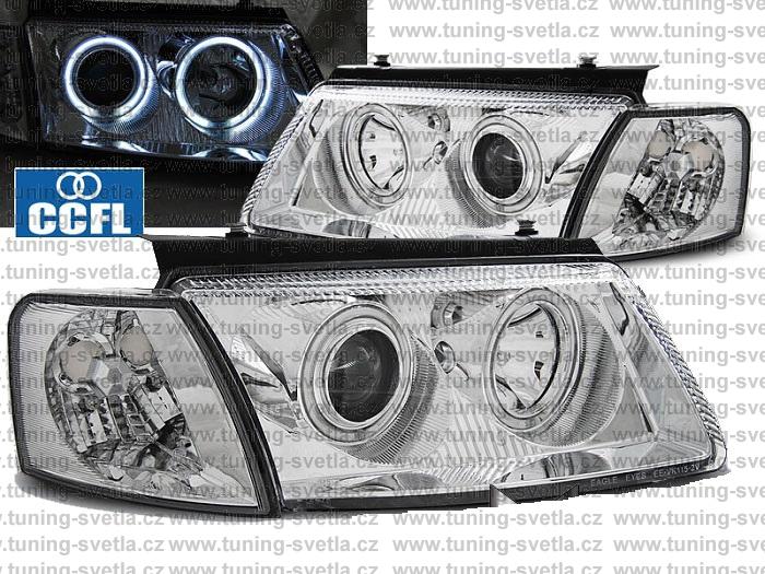 Popis: VW Passat B5 (1996-2000) přední angel eyes světla s CCFL kroužky. Provedení chrom + přední chrom blinkry. Patice na žárovky H7+H1. El. nastavitelná pomocí motorků z originálních světel. Cena za sadu.